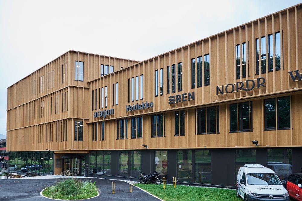 Ikke minst er det tenkt i bærekraftige integrasjoner – over vinduene er det montert lameller i samme profil som selve fasadekledningen. Disse fungerer som naturlig solskjerming, er nøye planlagt etter årstidenes lysinnfall, og er plassert etter parametrisk design.