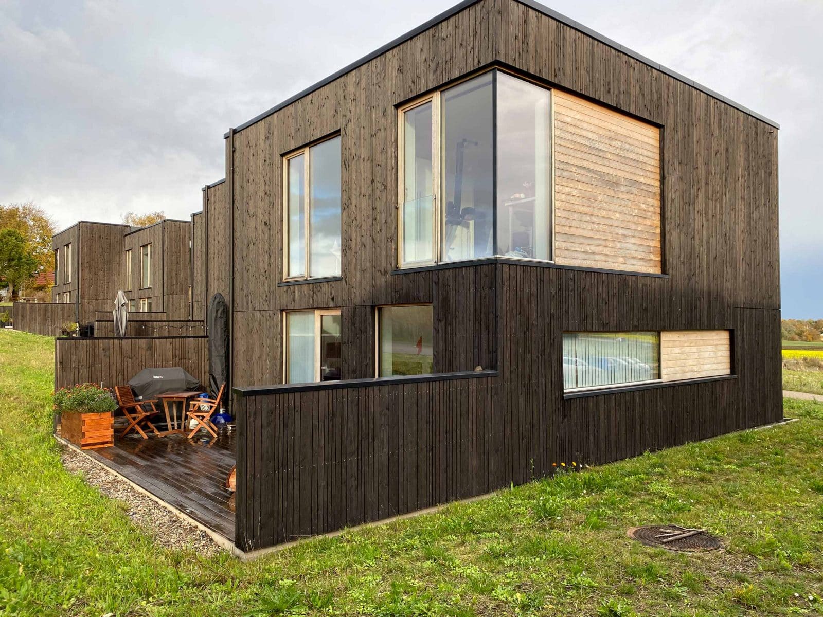 Her på bakken i Lystrup er det bærekraft og fellesskap som har vært utgangspunktet for arkitektenes tanker og linjer. Noen veldig fine familiehus har kommet ut av dette, der det er laget en fin løsning på fasaden, som kombinerer lys eik med en malt versjon av Superwood.